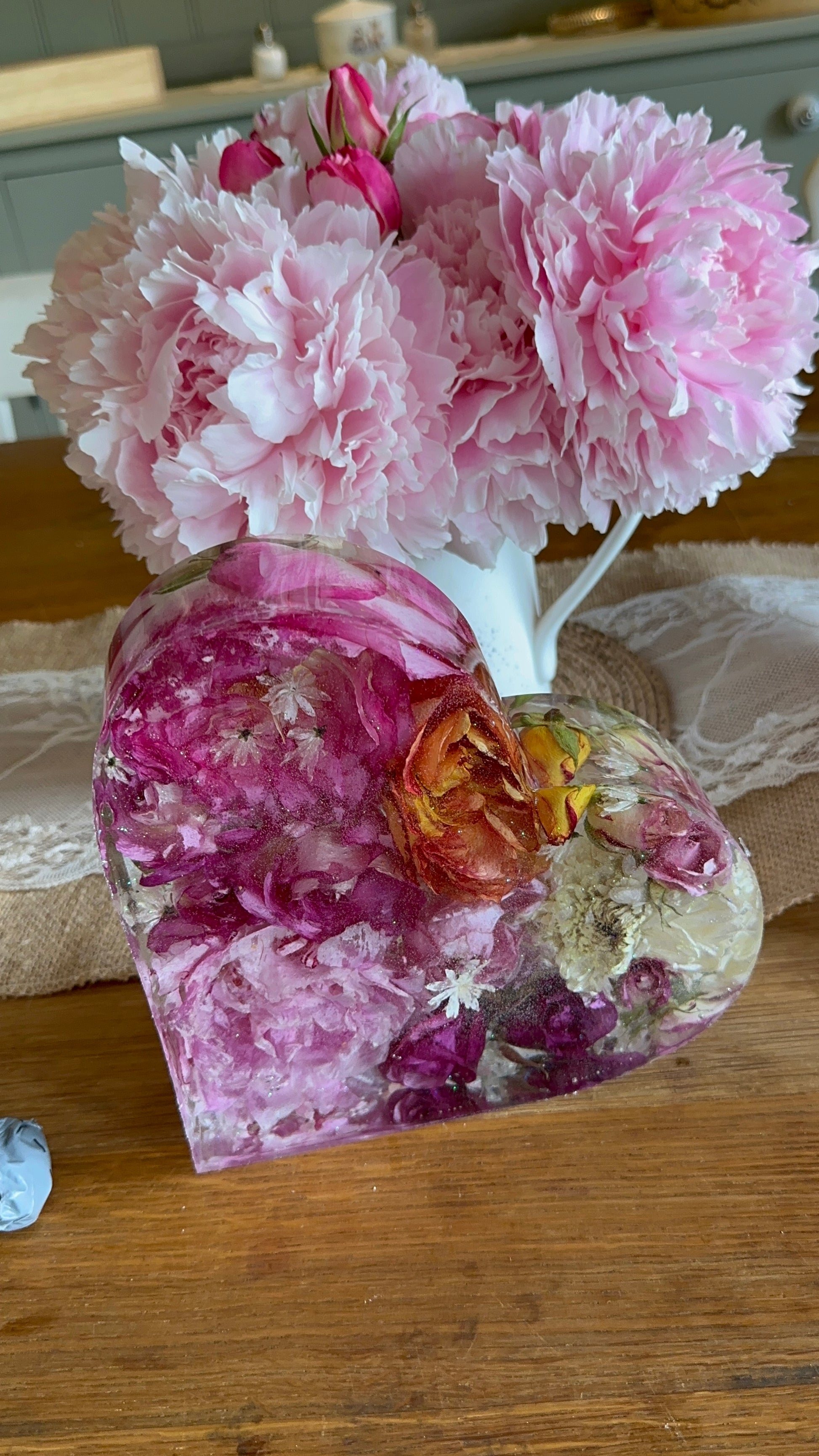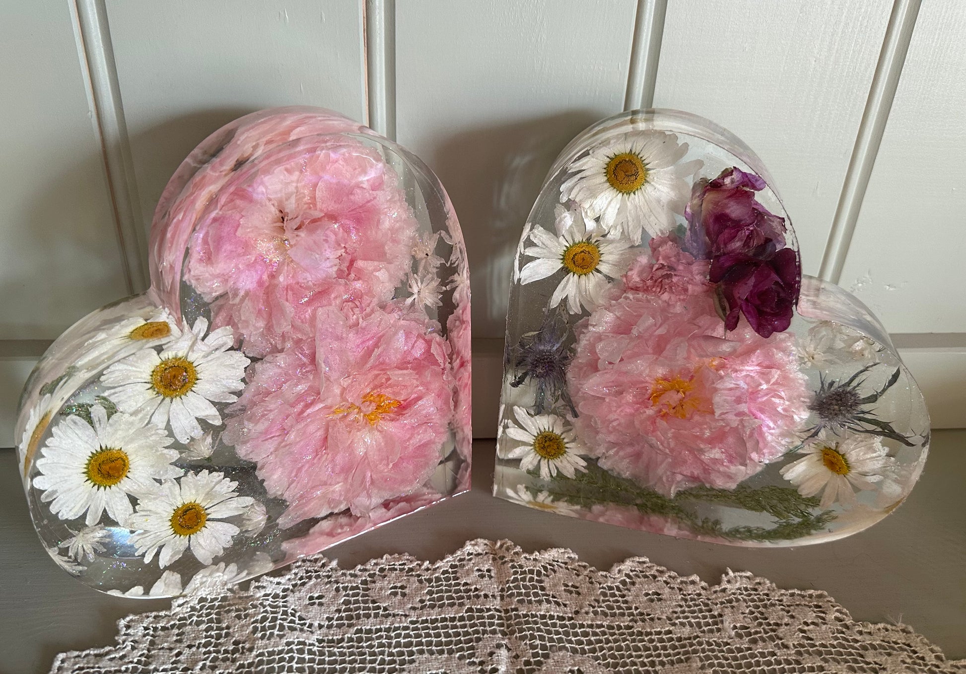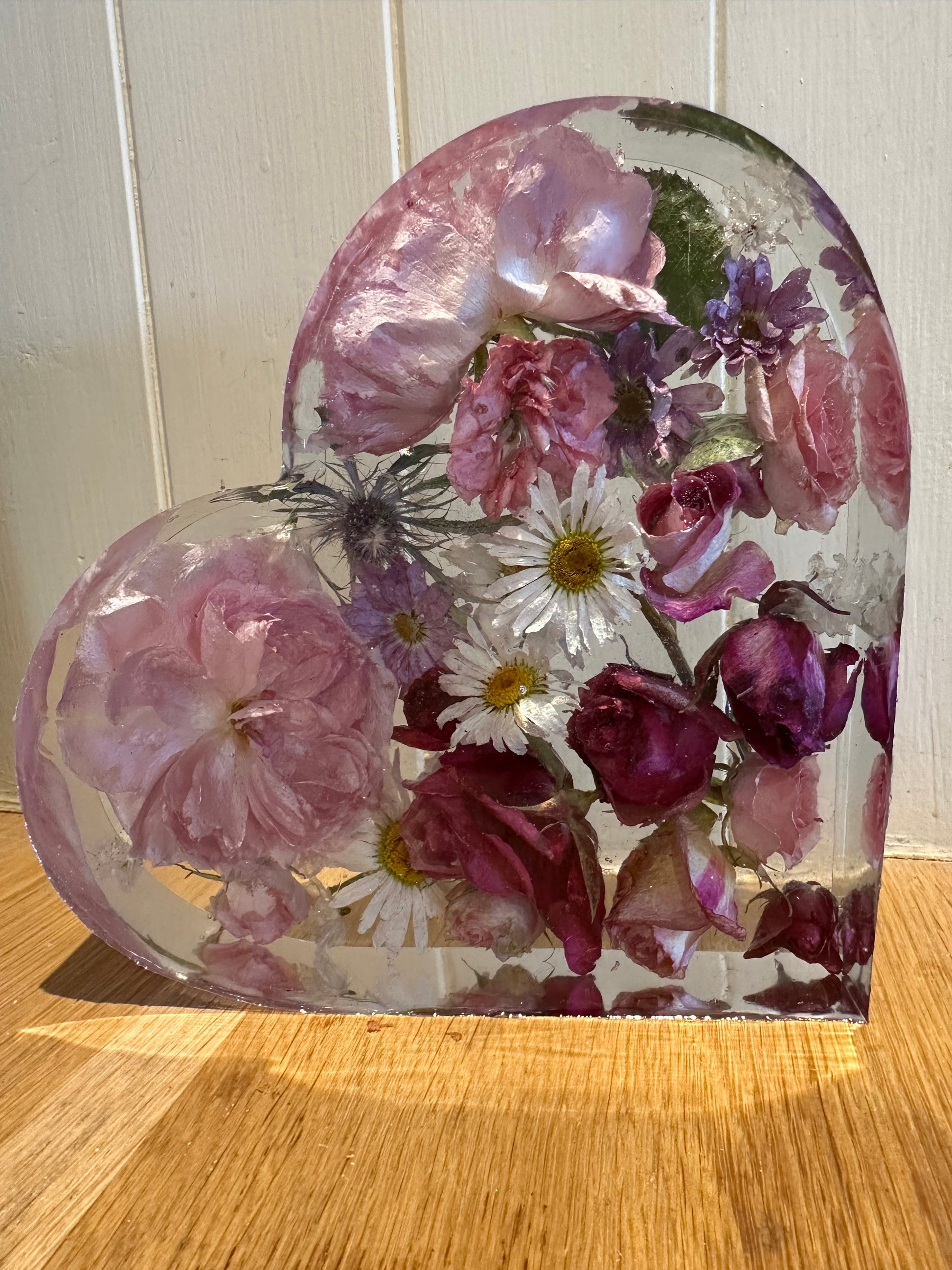 These are flowers from my garden dried in large resin hearts (20cm x 20cms ish) with a tiny sparkle. Everyone will be different with different flowers. My latest ones will be found @carthousecrafts on FB and Instagram